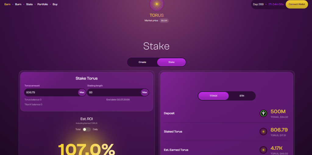 What is Staking? A way to earn rewards by putting your crypto to work on a blockchain network. For example, on torus.win, you stake your owned torus tokens using either ETH or TitanX (ETH or TitanX acts like fuel for the ecosystem to keep it running smoothly) to earn additional Torus tokens. The max stake period is 88 Days for torus.win tokens.